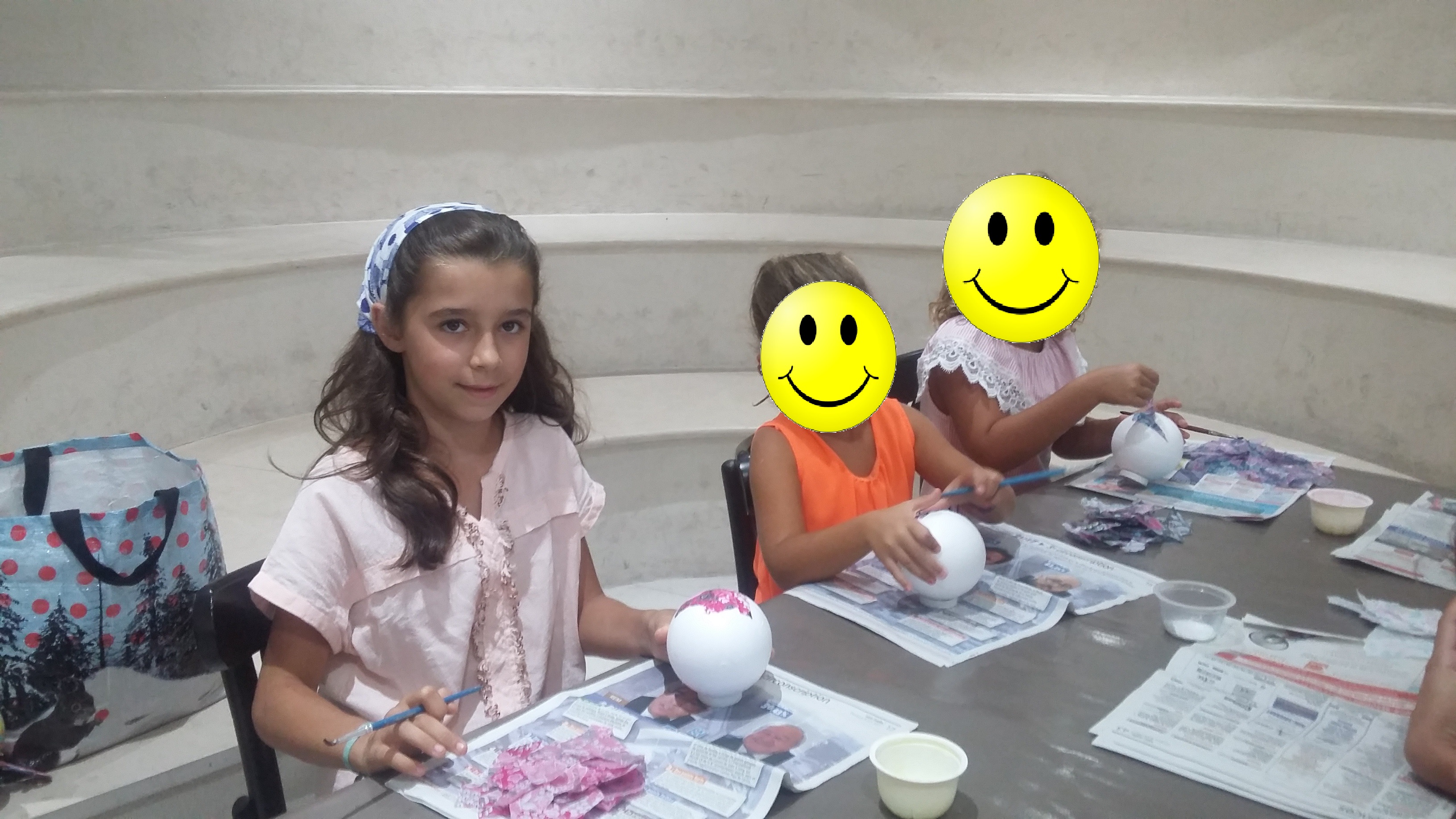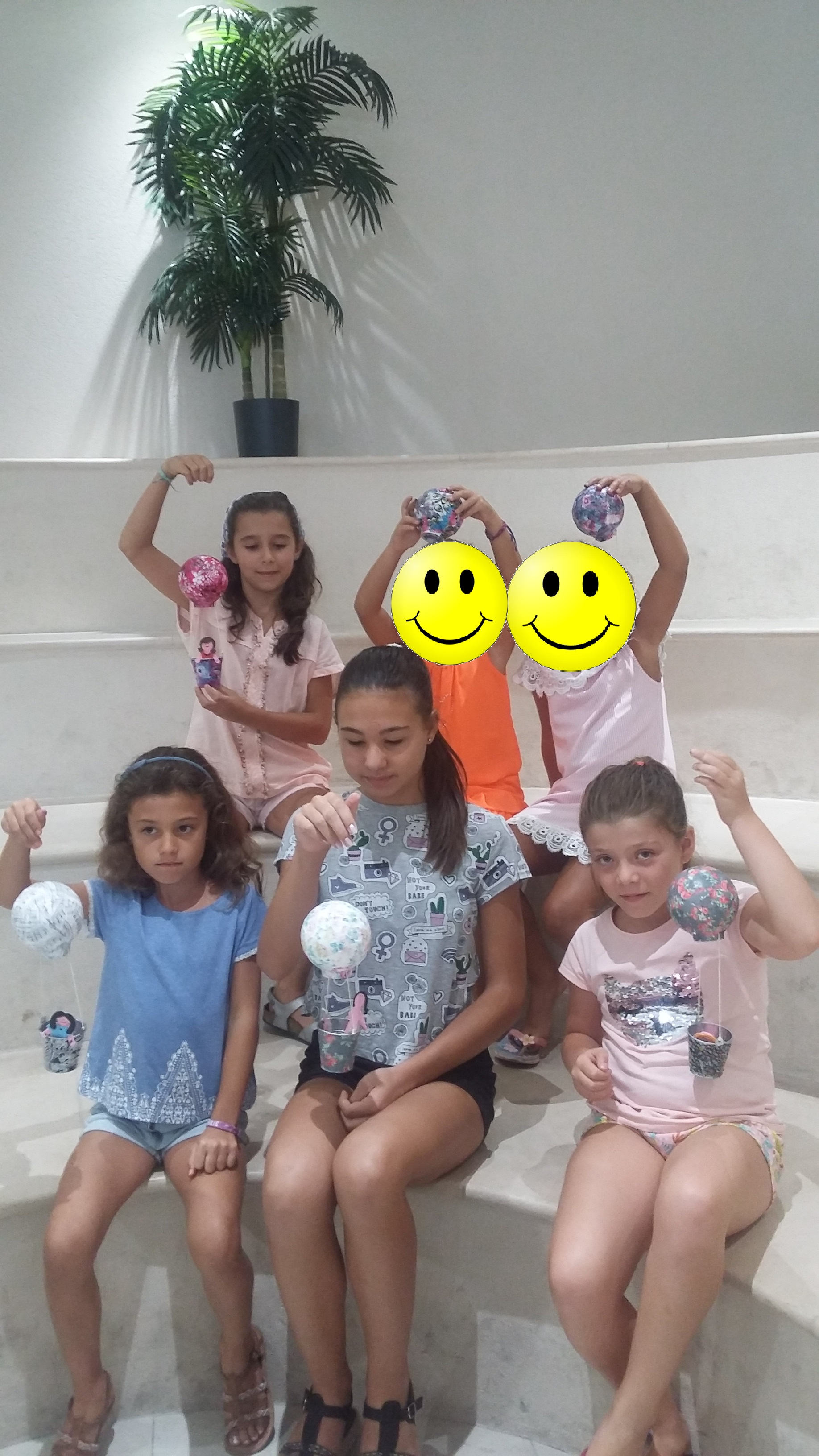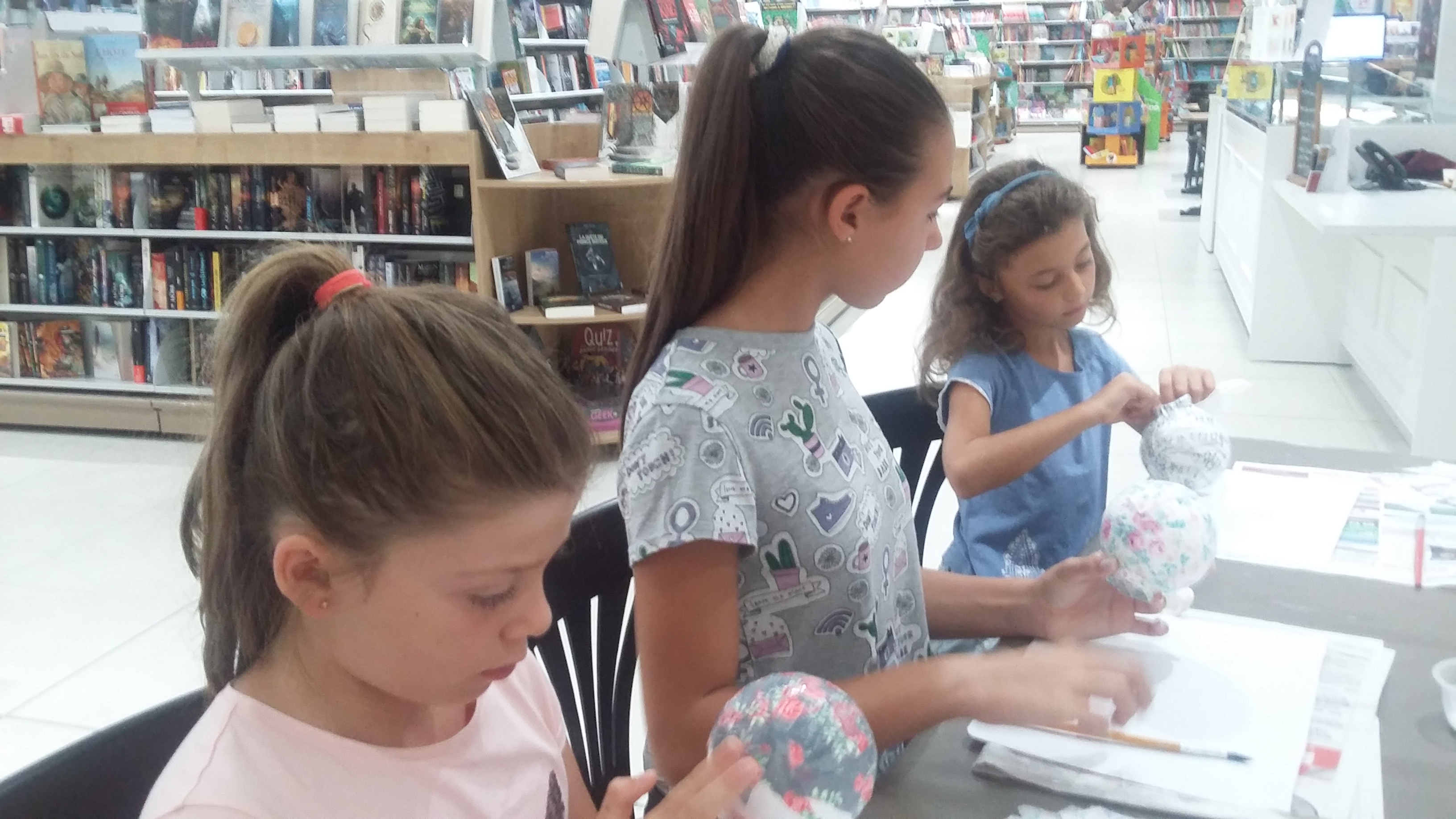Pour voyager dans les airs en montgolfière c’est sympa quand on est plusieurs et c’est pour cela que le mercredi 23/08/17 je fut rejointe par 6 jeunes filles Lucia (5 ans), Livia (7 ans), Emma (7 ans), Marie (7 ans), Albane ( 9 ans et demi) et Agathe (12 ans) toutes des habituées des ateliers du Forum. Ells ont recouvertes les boules de polystyrène avec du papier Décopatch ainsi que la nacelle. Ensuite il a fallu mettre les fils pour tenir les montgolfières. Beaucoup de rigolade et d’entraide dans ce petit groupe. Ensuite tout le monde s’est retrouvé autour d’un goûter bien mérité. Merci à toutes les 6 pour leur bonne humeur et ce merveilleux moment passé avec elles. Voici toutes les photos de l’atelier: