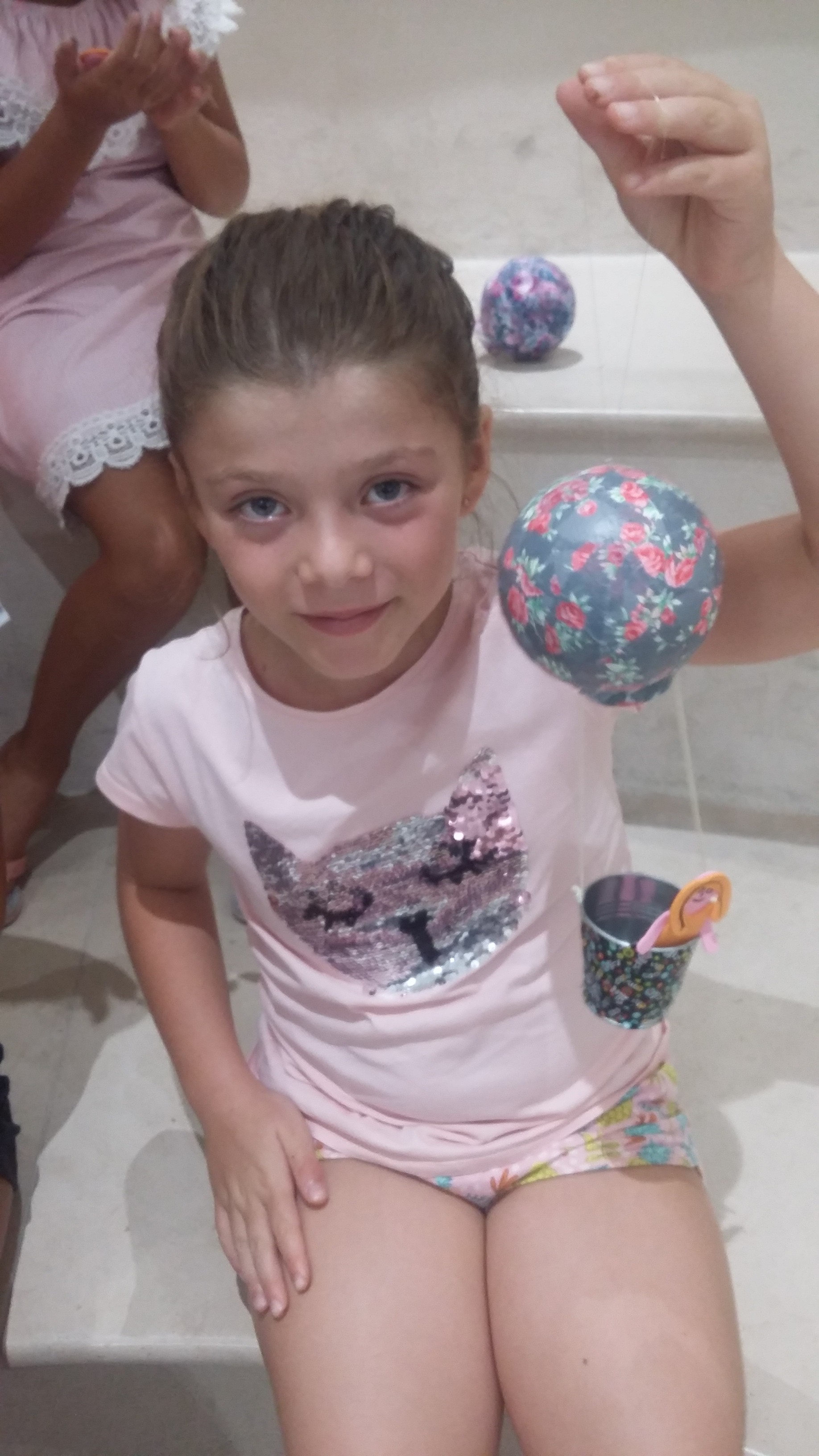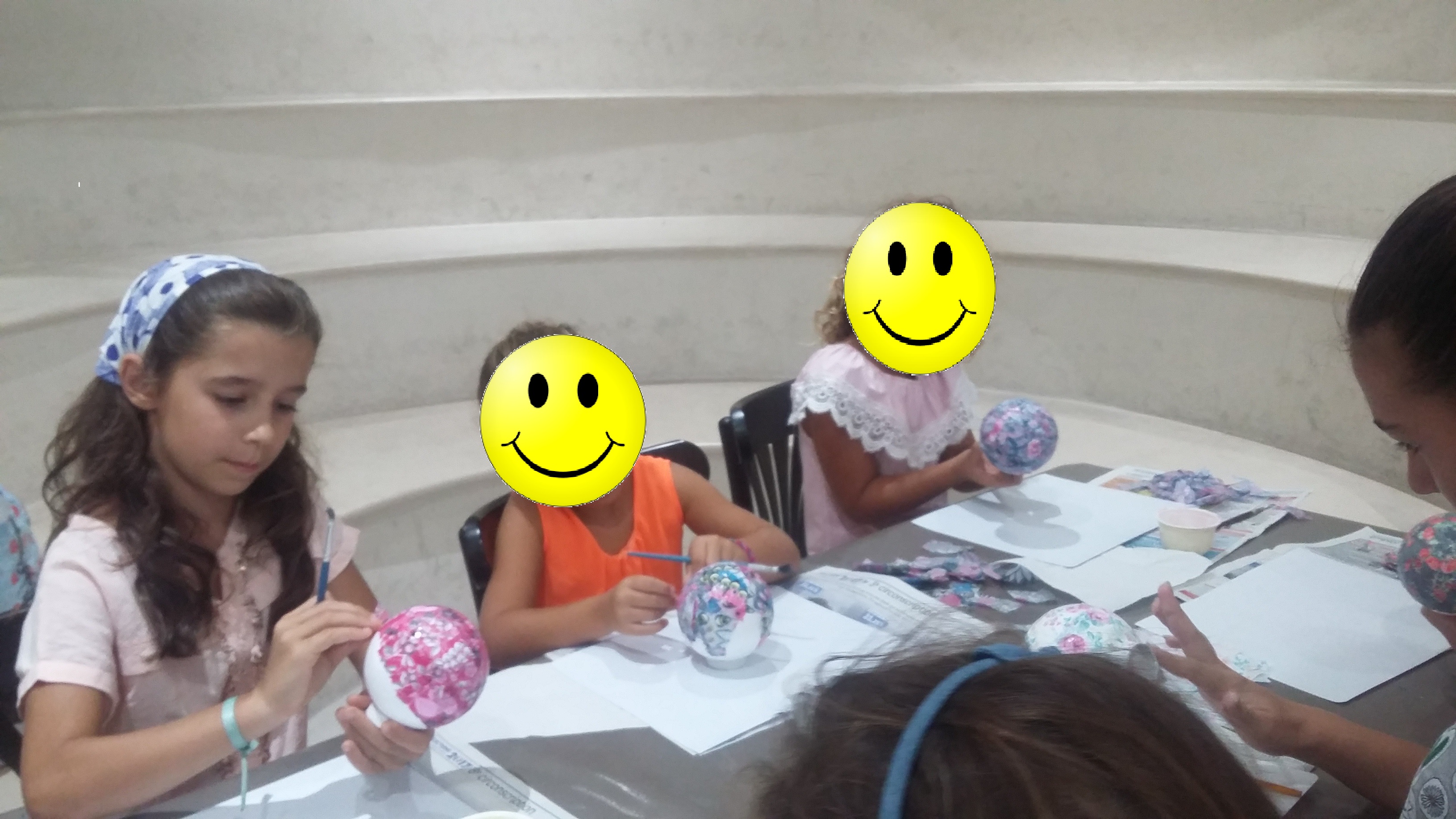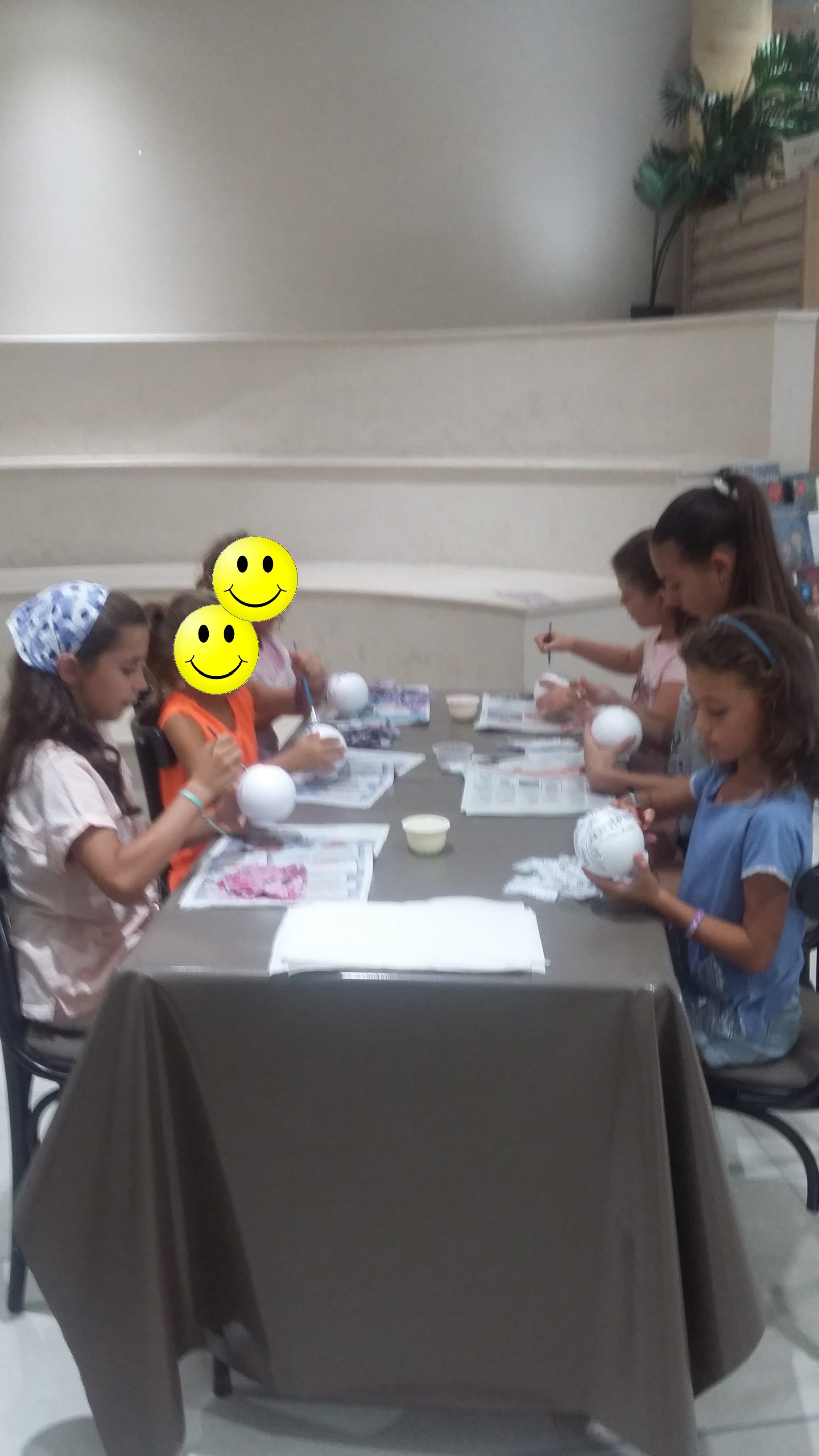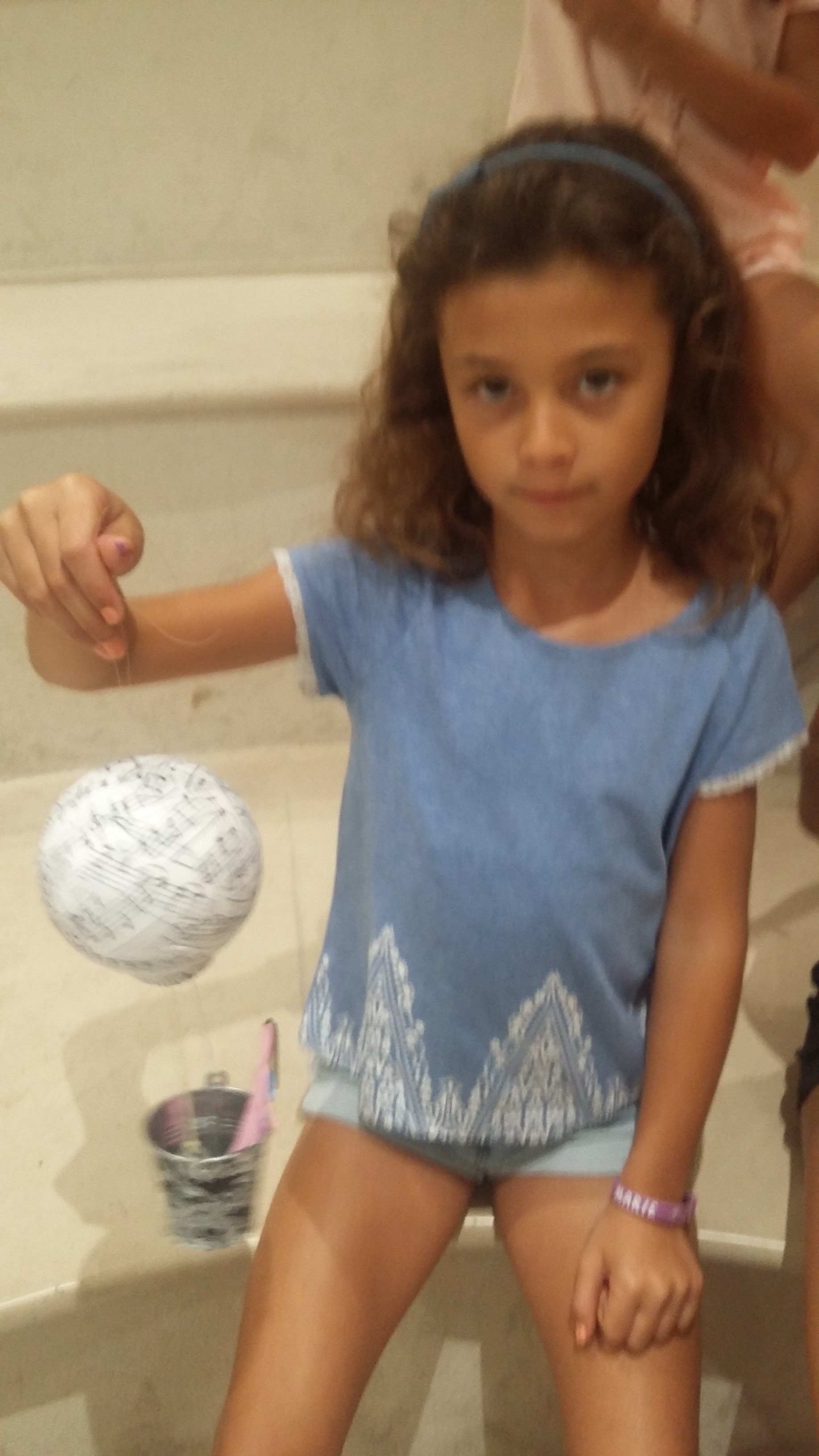 Pour voyager dans les airs en montgolfière c’est sympa quand on est plusieurs et c’est pour cela que le mercredi 23/08/17 je fut rejointe par 6 jeunes filles Lucia (5 ans), Livia (7 ans), Emma (7 ans), Marie (7 ans), Albane ( 9 ans et demi) et Agathe (12 ans) toutes des habituées des ateliers du Forum. Ells ont recouvertes les boules de polystyrène avec du papier Décopatch ainsi que la nacelle. Ensuite il a fallu mettre les fils pour tenir les montgolfières. Beaucoup de rigolade et d’entraide dans ce petit groupe. Ensuite tout le monde s’est retrouvé autour d’un goûter bien mérité. Merci à toutes les 6 pour leur bonne humeur et ce merveilleux moment passé avec elles. Voici toutes les photos de l’atelier: